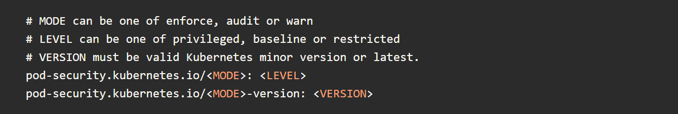 Pod Security 准入与内置的 Pod Security 准入控制器配合使用;您需要在集群中使用 –feature-gates=”...,PodSecurity=true” 或使用 pod admission webhook启用此功能。它应用于 命名空间级别,带有以下标签: