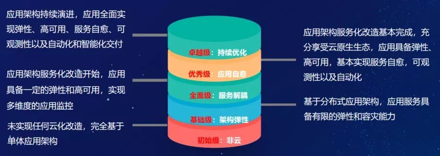 云原生业务应用综合成熟度水平分为5级,分别为初始级(非云)、基础级(架构弹性)、全面级(服务解耦)、优秀级(应用自愈)以及卓越级(持续优化)。