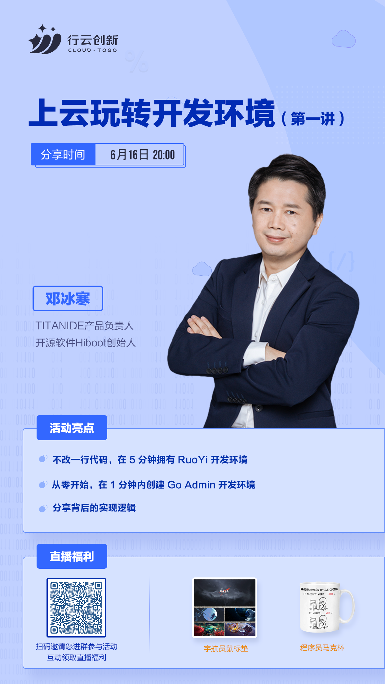 6月16日20:00,“上云玩转开发环境”第一讲即将开启!多宝电竞创新 TitanIDE 产品负责人邓冰寒将分享:如何利用 TitanIDE 在不改一行代码情况下,在5分钟拥有 RuoYi 开发环境;如何从零开始,在1分钟内创建 Go Admin 开发环境;以及分享这背后的实现逻辑。直播间还会送出宇航员鼠标垫、程序员马克杯等福利,快扫码参与活动吧~